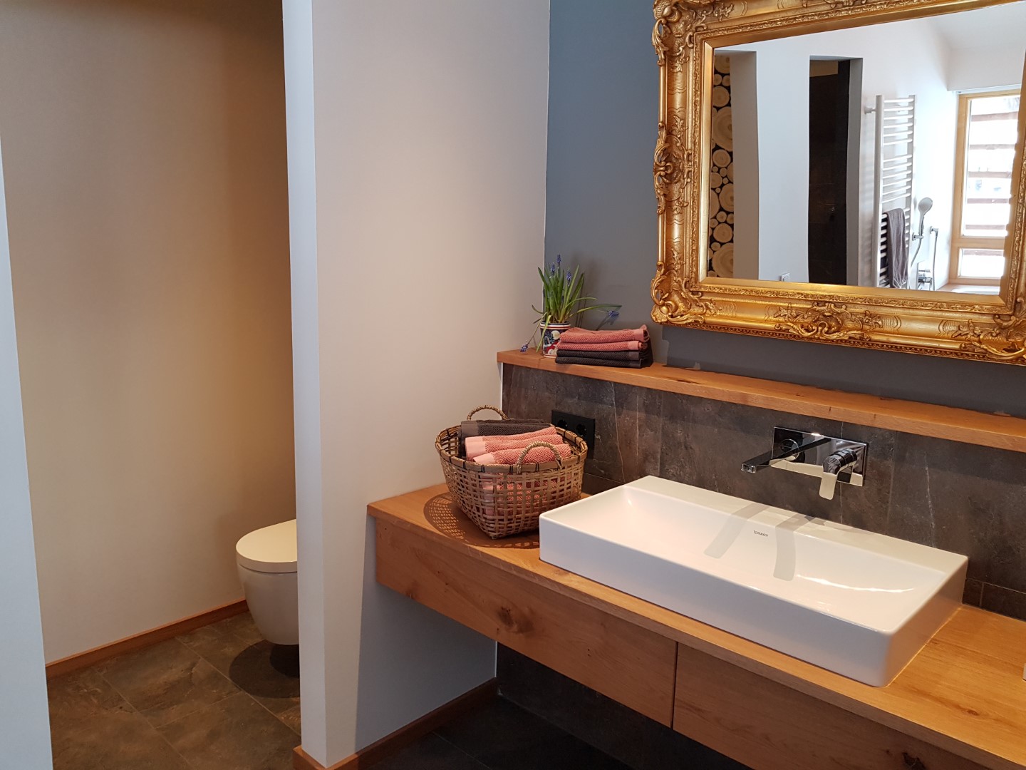 Die Ferienwohnung „Kaiserwinkl“ (Wohnung 1) liegt im Erdgeschoss, mit Terrasse und direktem Gartenzugang. Sie ist nach Süden ausgerichtet und bietet einen Panoramablick auf das Kaisergebirge.